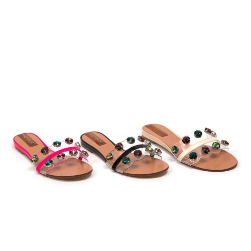 LUCITE FLAT O/T SANDAL W/ MULTICOLORED JEWELED TRIM COLORS: BEIGE, BLACK, FUCHSIA For more information, please contact the office